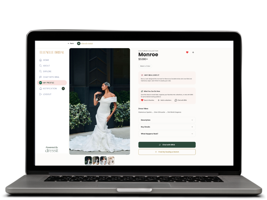 Dressit processes what BRIA discovers into actionable business intelligence. See which designs create authentic connection, track confidence patterns, and understand demand signals across your entire collection. Control how qualified leads get routed to your authorized boutiques.